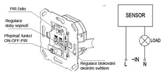 Určeno k montáži místo vypínače, připojení dvěma vodiči.