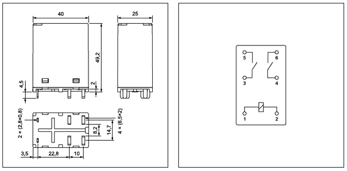 Konfigurace kontaktů: DPST-NO (2x spínací kontakt, v klidu rozepnutý)