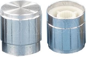 Hliníkový-plastový přístrojový knoflík na potenciometry s drážkovanou hřídelí.