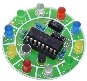 Stavebnice barevné hudby tvořené 10-ti LED diodami různých barev (červená, žlutá, modrá, zelená, bílá vždy po 2ks).