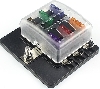 Distribuční blok pojistek s centrálním přívodem kladného i záporného pólu a 12-ti pojistkami s optickou kontrolou stavu přerušení (12x LED).
