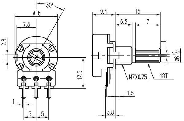 Hřídel: kovový, drážkovaný, průměr 6mm, délka 7mm