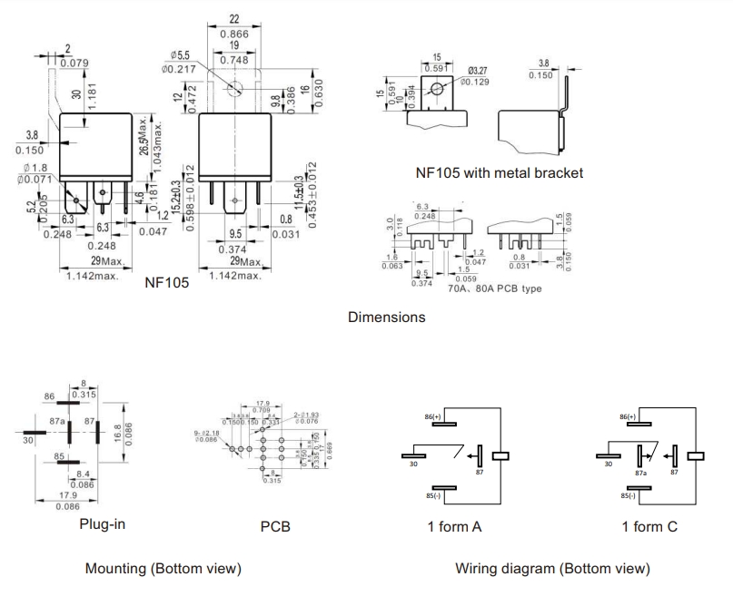 Vývody: piny do plošného spoje (cívka: 2x jednoduchý pin, kontakty: 2x trojitý pin)