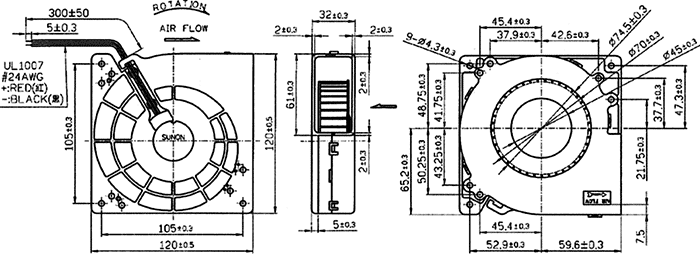 Ventilátor 12VDC, 120x120x32mm, 9.8W, typ Blower, kuličková ložiska