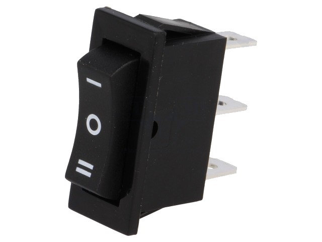 Kolébkový spínač bez aretace 10A/250VAC, 1x přepínací kontakt.