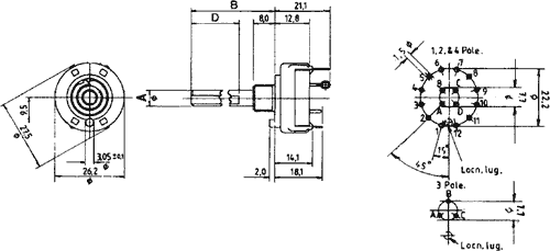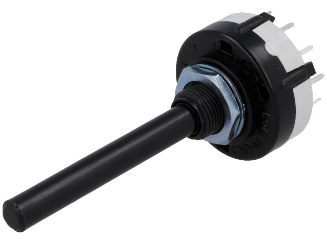 Otočný přepínač 4x3 polohy s piny do plošného spoje, 0.15A, 250VAC/DC.