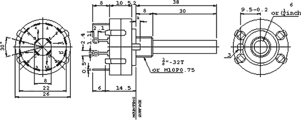 Otočný přepínač 2x6 poloh s pájecími očky, 0.3A/125VAC, 1A/30VDC.