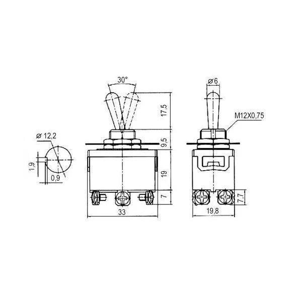 Páčkový spínač bez aretace v krajních polohách 10A/250VAC, 2x přepínací kontakt