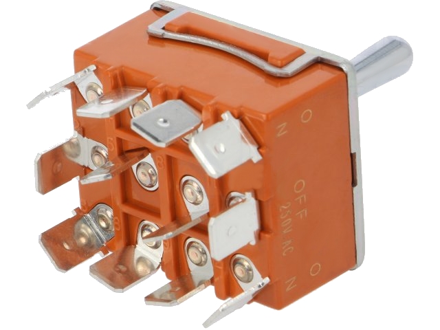 Páčkový spínač s aretací ve všech polohách 15A/250VAC, 4x přepínací kontakt