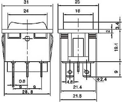 Kolébkový spínač bez aretace v krajních polohách 15A/250V, 2x přepínací kontakt