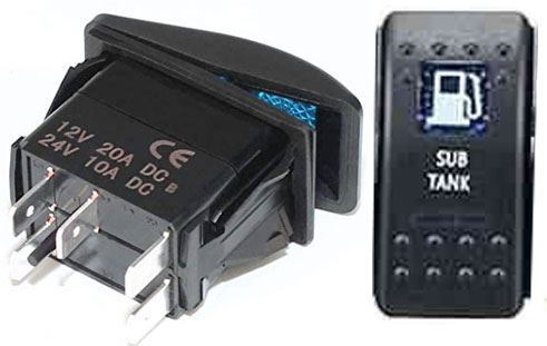 2x nezávislé prosvětlení – 1. pro prosvětlení symbolu při zapnutých světlech a 2. pro indikanci zapnutého stavu, symbol pomocné palivové nádrže