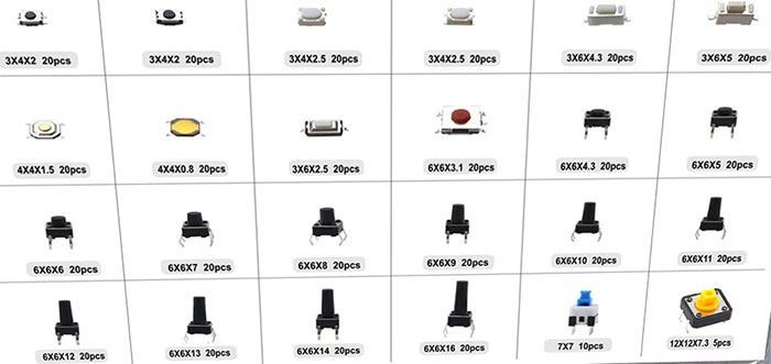 Sada různých tlačítek TACT (Tactile Switch) pro povrchovou montáž SMD i s piny do plošného spoje.
