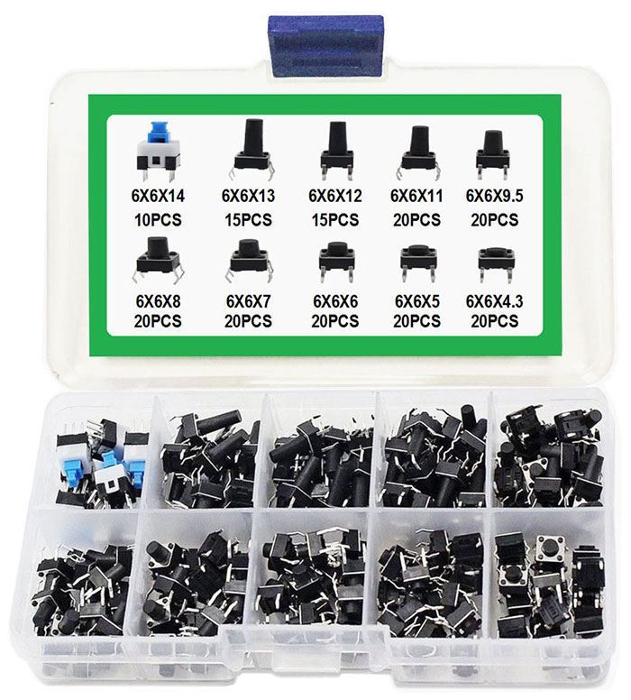 Sada různých tlačítek TACT (Tactile Switch) s piny do plošného spoje.