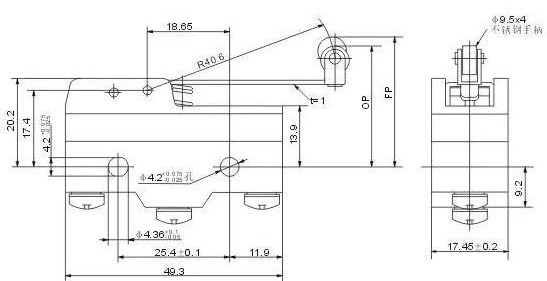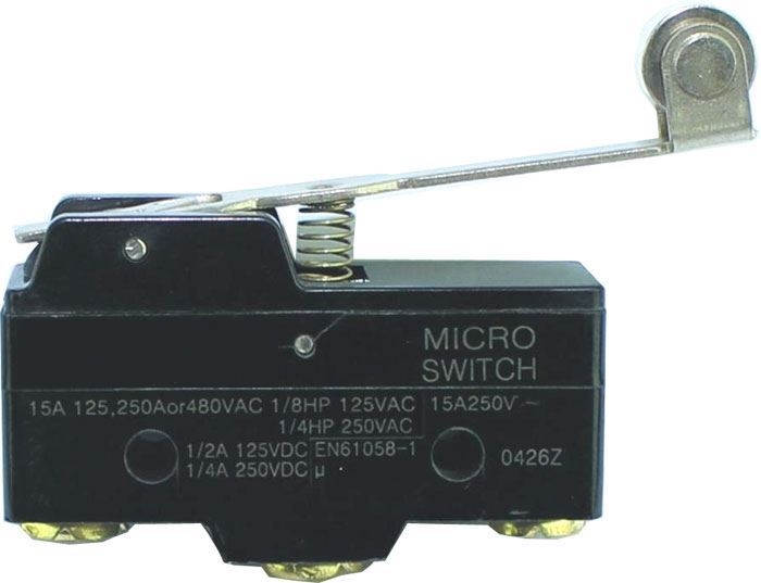 Mikrospínač 250V/15A s páčkou s kladkou.