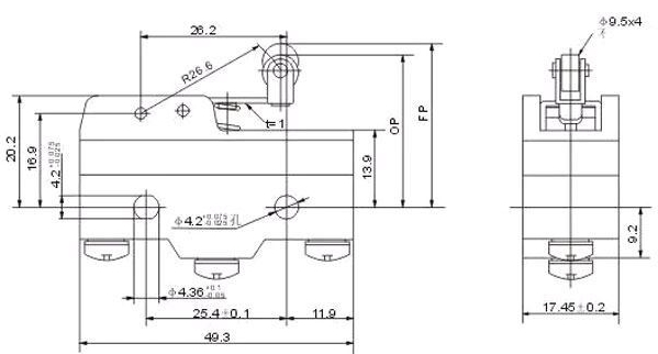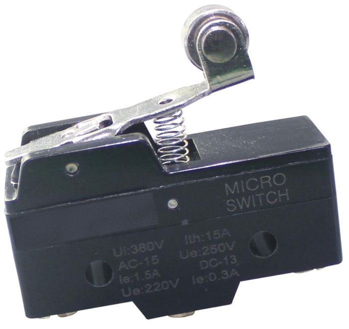Mikrospínač 250V/15A s páčkou s kladkou.