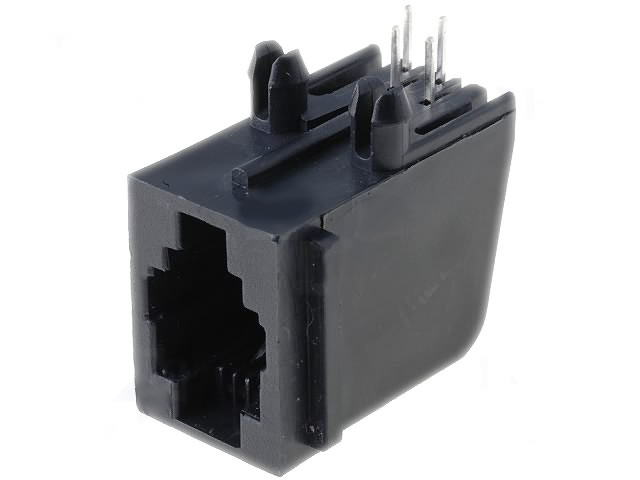 US telefonní zásuvka 4P4C do plošného spoje, osazené 4piny, kontakty nahoře, horizontální (vstup na boku)