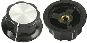 Bakelitový přístrojový knoflík s hliníkovým středem a ukazatelem.