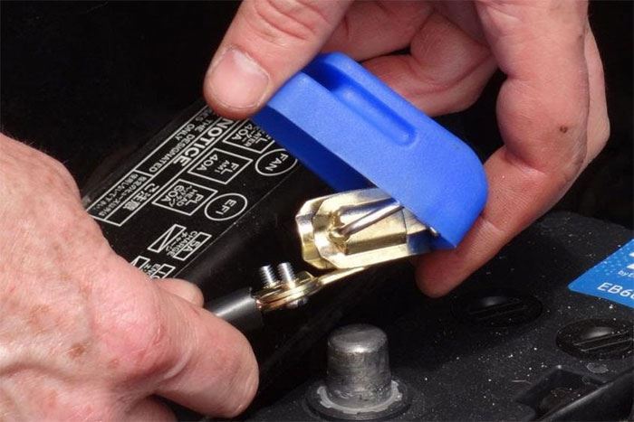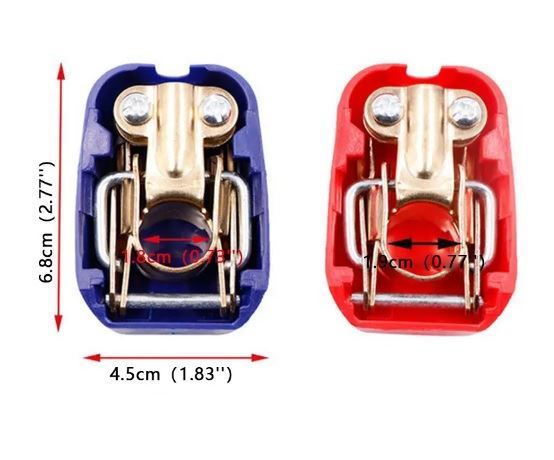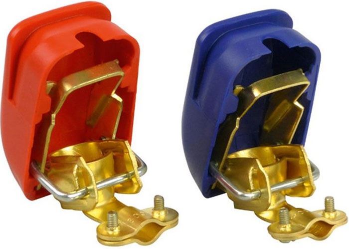 Sada svorek na olověné auto akumulátory, kladný pól (+) a záporný pól (-).