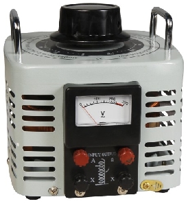 Regulační autotransformátor s analogovým ručkovým měřidlem pro zobrazení výstupního napětí.