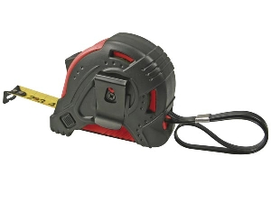 Metrické měřidlo, aretační tlačítko, pogumovaný povrch, ocelové pouzdro a naviják, poutko na zápěstí, spona na opasek.