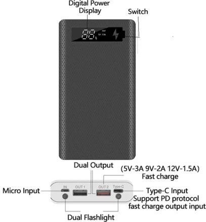 Vstup/výstup: USB C, QC, 5V/3A, 9V/2A, 12V/1,5A, autodetekce nabíjecího napětí.