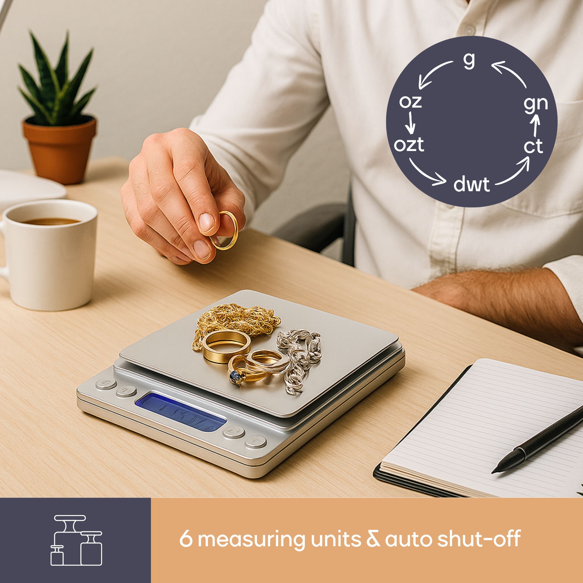 Tato digitální kapesní váha umožňuje snadno, rychle a přesně vážit přísady, prášky, koření, šperky, léky a další malé předměty s přesností na 0,01 g v gramech (g), unci (oz), trojské unci (ozt), pennyweight (dwt), karátech (ct) a grainech (gn).