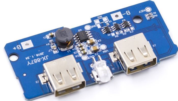 Univerzální modul kombinující nabíječku Li-Ion článků a step-up měnič pro napájení různých zařízení napětím 5V.