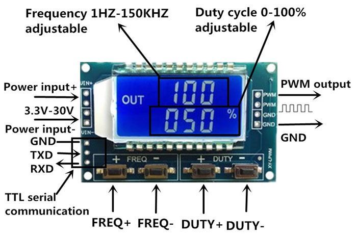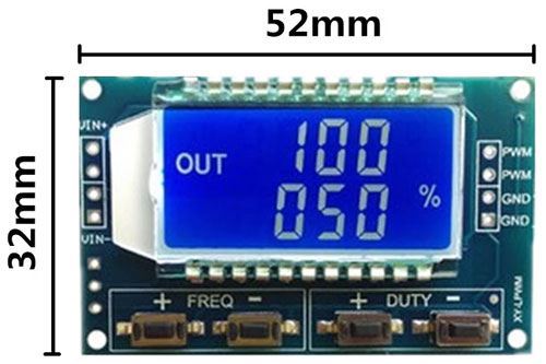 Generátor obdélníkového signálu 1Hz-150kHz s možností změny střídy vrozsahu 0–100% s LCD displejem.