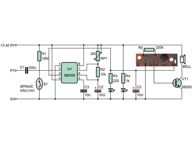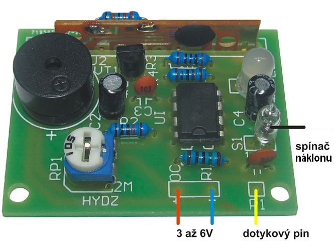 Stavebnice poplašného zařízení reagujícího na náklon, kdy sepne spínač náklonu a dále má funkci dotykového alarmu při kontaktu s pinem P1.