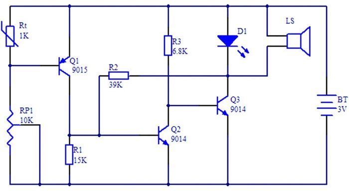Obvod této sady je velmi jednoduchý, je složen ze tří tranzistorů (dva S9014 a jeden S9015), bzučáku, LED diody a termistoru.
