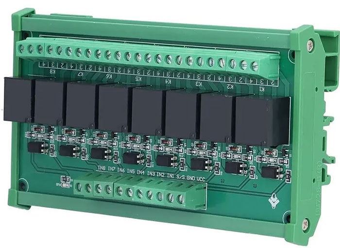 8-mi kanálový relé modul s optočlenem, napájecím napětím 24V a spouštěný signálem Log 0 nebo Log 1 (12mA).