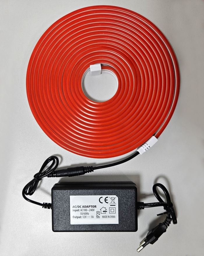 Neonový červený LED pásek s adaptérem pro připojení do sítě.