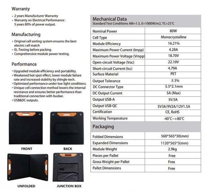 Fotovoltaický solární panel 12V/80W, přenosný, skládací.