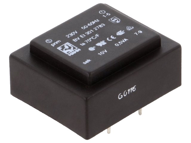 Transformátor 0.5VA, 230VAC/10VAC-50mA, zalitý, piny do plošného spoje