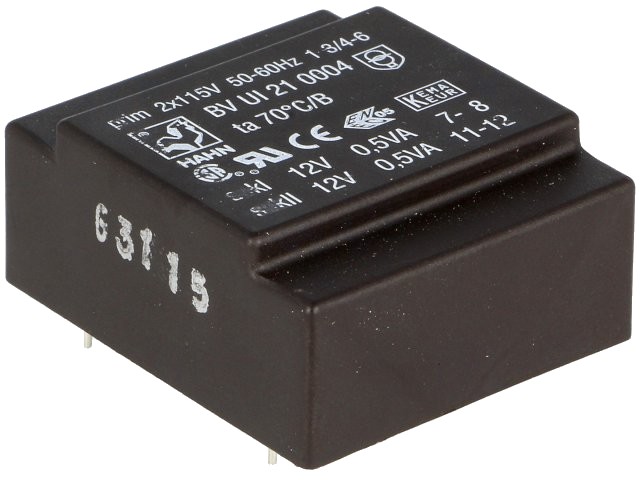 Transformátor UI 1VA, 2x115VAC/2x12VAC-41mA, zalitý, piny do plošného spoje