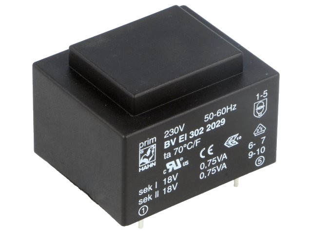 Transformátor 1.5VA, 230VAC/2x18VAC-41mA, zalitý, piny do plošného spoje