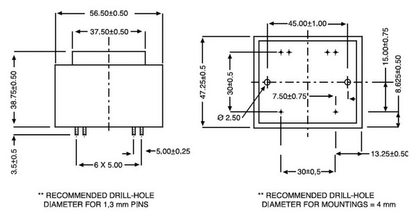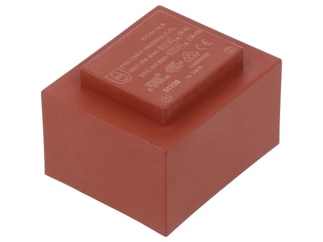 Transformátor 16VA, 230VAC/2x9VAC-889mA, zalitý, piny do plošného spoje